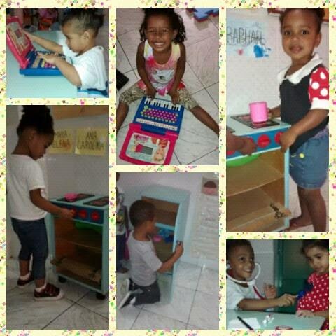 Conversamos, desenhamos nossas famílias, listamos as pessoas de uma família, nomeamos nossos familiares num jogo de batata-quente, brincamos de casinha e muito mais!